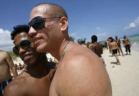 A couple holds each other during the opening of the gay and lesbian community's summer at a beach on the outskirts of Havana June 14, 2008. [Agencies]