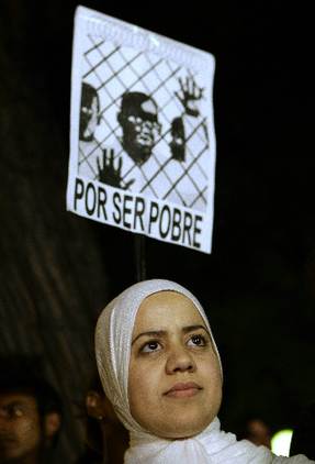 A woman attends a demonstration against immigrant detention centres, in front of the European Union Office in Madrid June 17, 2008. The banner reads: "Because I'm Poor". [Agencies]