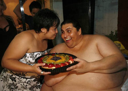 Manuel Uribe jokes as he holds a fruit cake with his girlfriend Claudia Solis outside his house in the suburb of San Nicolas de los Garza in the northern city of Monterrey June 11, 2008. Uribe, once the world's most obese man, celebrated his 43rd birthday on Wednesday with a very short trip outside his house. "I'm happy that it is my birthday," he told reporters interviewing the man who weighed 717 pounds (324 kg) in May after losing 518 pounds (235 kg) since March 2006 on a diet of grapefruits, egg-white omelets, fish, chicken and vegetables. [Agencies]