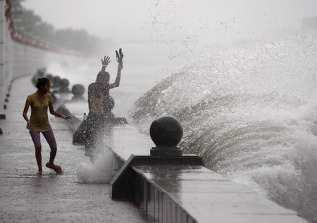 A couple plays in the waves at Manila Bay caused by Typhoon Fengshen as it rolls over Manila June 22, 2008. The typhoon roared through Manila early on Sunday and is expected to head towards Taiwan in the next few days. [Agencies]