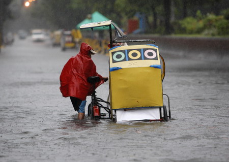 A man pushes his pedicab through a flooded street caused by Typhoon Fengshen as it rolls over Manila June 22, 2008. The typhoon roared through Manila early on Sunday and is expected to head towards Taiwan in the next few days. [Agencies]