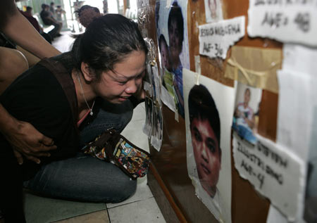 A relative cries as she posts a photo of her kindred, who was on board the capsized ferry MV Princess of Stars, inside the terminal of Sulpicio Lines in Manila June 24, 2008. [Agencies]