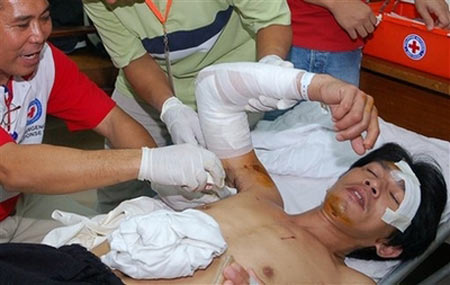In this handout released by the Philippine National Red Cross, Jonathan Pendon, a survivor in the MV Princess of Stars, is treated in Manila Tuesday, June 24, 2008. Two teams of rescuers prepared to dive into rough waters off the Philippine coast Tuesday to find a way inside a capsized ferry in a desperate effort to locate 800 people believed to be still aboard. [Agencies]
