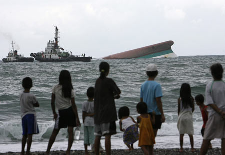 Residents gather along the shoreline to watch the grim retrieval operation of the capsized ferry MV Princess of Stars, off Sibuyan island, central Philippines June 24, 2008. [Agencies]