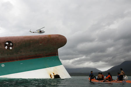 A rescue helicopter flies over while Philippine coast guard divers sail on a rubber boat beside the capsized ferry MV Princess of Stars, off Sibuyan island, central Philippines June 24, 2008. [Agencies]