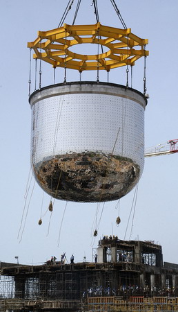 A nearly 200 ton nuclear reactor safety vessel is erected at the Indira Gandhi Centre for Atomic Research at Kalpakkam, about 80 km (48 miles) from the southern Indian city of Chennai, June 24, 2008. [Agencies]