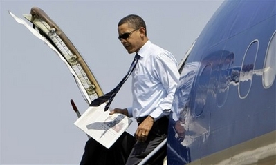 Democratic presidential candidate Sen. Barack Obama D-Ill., gets off the campaign charter plane in Los Angeles, Tuesday, June 24, 2008. [Agencies]