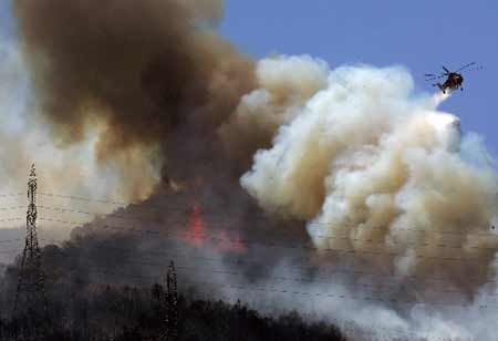 A fire-fighting airplane unloads water during a forest fire at the mountain of Hymettus, near Athens June 25, 2008. [Agencies]