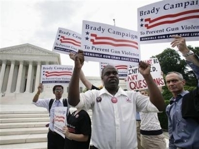 Scalia noted that the handgun is Americans' preferred weapon of self-defense in part because "it can be pointed at a burglar with one hand while the other hand dials the police." But he said nothing in the ruling should "cast doubt on long-standing prohibitions on the possession of firearms by felons or the mentally ill, or laws forbidding the carrying of firearms in sensitive places such as schools and government buildings." In a concluding paragraph to the 64-page opinion, Scalia said the justices in the majority "are aware of the problem of handgun violence in this country" and believe the Constitution "leaves the District of Columbia a variety of tools for combating that problem, including some measures regulating handguns." D.C. Mayor Adrian Fenty responded with a plan to require residents to register their handguns. "More handguns in the District of Columbia will only lead to more handgun violence," Fenty said. In a dissent he summarized from the bench, Justice John Paul Stevens wrote that the majority "would have us believe that over 200 years ago, the Framers made a choice to limit the tools available to elected officials wishing to regulate civilian uses of weapons." He said such evidence "is nowhere to be found." Justice Stephen Breyer wrote a separate dissent in which he said, "In my view, there simply is no untouchable constitutional right guaranteed by the Second Amendment to keep loaded handguns in the house in crime-ridden urban areas." Joining Scalia were Chief Justice John Roberts and Justices Samuel Alito, Anthony Kennedy and Clarence Thomas. The other dissenters were Justices Ruth Bader Ginsburg and David Souter. Gun rights advocates praised the decision. "I consider this the opening salvo in a step-by-step process of providing relief for law-abiding Americans everywhere that have been deprived of this freedom," said Wayne LaPierre, executive vice president of the National Rifle Association. The NRA will file lawsuits in San Francisco, Chicago and several Chicago suburbs challenging handgun restrictions there based on Thursday's outcome. Some Democrats also welcomed the ruling. "This opinion should usher in a new era in which the constitutionality of government regulations of firearms are reviewed against the backdrop of this important right," said Sen. Patrick Leahy of Vermont. The capital's gun law was among the nation's strictest. Dick Anthony Heller, 66, an armed security guard, sued the district after it rejected his application to keep a handgun at his Capitol Hill home a short distance from the Supreme Court. "I'm thrilled I am now able to defend myself and my household in my home," Heller said shortly after the opinion was announced. The US Court of Appeals for the District of Columbia ruled in Heller's favor and struck down the district's handgun ban, saying the Constitution guarantees Americans the right to own guns and a total prohibition on handguns is not compatible with that right. The issue caused a split within the Bush administration. Vice President Dick Cheney supported the appeals court ruling, but others in the administration feared it could lead to the undoing of other gun regulations, including a federal law restricting sales of machine guns. Other laws keep felons from buying guns and provide for an instant background check. The last Supreme Court ruling on the matter came in 1939 in US v. Miller, which involved a sawed-off shotgun. Constitutional scholars agree it did not squarely answer the question of individual versus collective rights. The case is District of Columbia v. Heller, 07-290. |