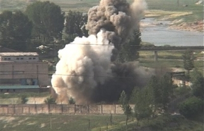 In this image from television, the Democratic People's Republic of Korea blasted the cooling tower at its nuclear complex in Yongbyon . [Agencies]