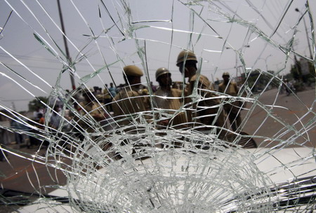 Policemen are seen through the damaged windscreen of a police vehicle during a demonstration against the revocation of the government's decision to hand over nearly 100 acres (40 hectares) of forest land to a Hindu shrine trust, in Jammu July 1, 2008. [Agencies]