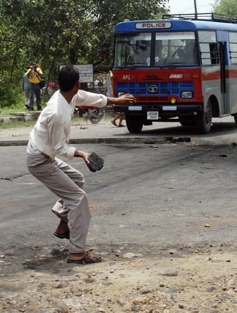 A protester prepares to throw a stone towards a police bus during a demonstration against the revocation of government's decision to hand over nearly 100 acres (40 hectares) of forest land to a Hindu shrine trust, in Jammu July 1, 2008. [Agencies]