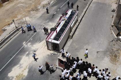 Israeli police officers walk near an overturned bus at the scene of an attack in Jerusalem July 2, 2008. A Palestinian rammed a bulldozer into an Israeli commuter bus, cars and pedestrians on one of Jerusalem's busiest streets on Wednesday, killing at least two people and wounding dozens, emergency services said. [Agencies]