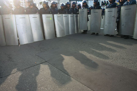 Riot policeman stand guard while anti-G8 activists hold a demonstration in Sapporo, north Japan, July 5, 2008. [Xinhua]