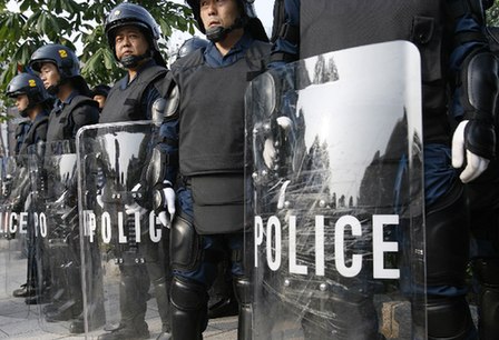 Japanese riot police keep watch over an anti-G8 demonstration held by labour unions in Sapporo, on Japan's northern island of Hokkaido, July 6, 2008, ahead of the G8 Hokkaido Toyako Summit which begins on Monday. [Agencies]
