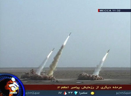 A video grab from Al Alam television shows three of nine long- and medium-range missiles being fired during a test in Iran July 9, 2008. [Agencies] |