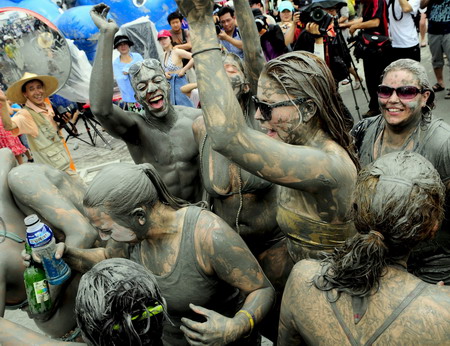 People play with mud during the 11th Boryeong Mud Festival at a beach in Boryeong, about 190 km (118 miles) southwest of Seoul, July 13, 2008. [Agencies]