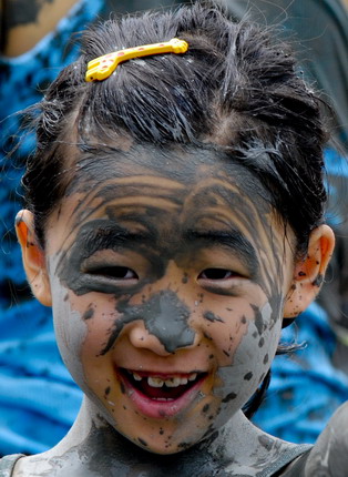 A girl plays with mud during the 11th Boryeong Mud Festival at a beach in Boryeong, about 190 km (118 miles) southwest of Seoul, July 13, 2008. [Agencies]