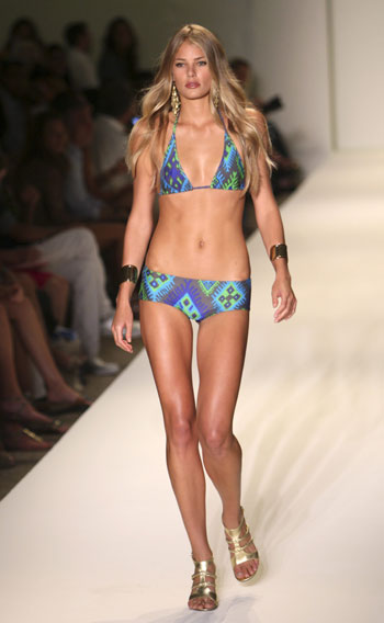 A model walks the runway wearing Tibi swimwear during Mercedes-Benz Fashion Week Swim show in Miami July 18, 2008. [Agencies]