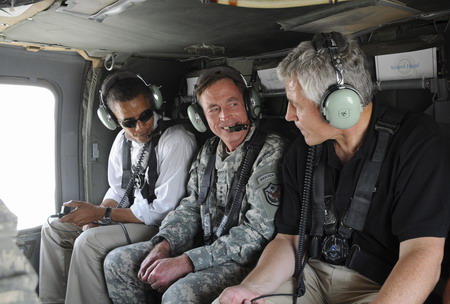 US Commander in Iraq General David Petraeus (C) shares a laugh with visiting US Democratic presidential candidate Barack Obama (L) and US senator Chuck Hagel during an aerial tour of Baghdad upon their arrival in Iraq July 21, 2008. [Agencies]