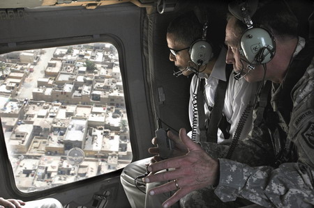 Gen. David H. Petraeus (R) explains security improvements in Sadr City while giving an aerial tour of Baghdad to Senators Barack Obama (D-IL), Jack Reed (D-RI) and Chuck Hagel (R-NE) July 21, 2008. [Agencies]