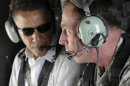 US Senator Barack Obama (D-IL) listens as Gen. David H. Petraeus (R) discusses security improvements in Baghdad while giving him and Senators Jack Reed (D-RI) and Chuck Hagel (R-NE) an aerial tour of the city July 21, 2008. [Agencies]