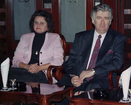 Bosnian Serb wartime leader Radovan Karadzic (R) with his wife Ljiljana Zelen Karadic (L) sit in a hotel hotel lobby in Banjaluka in this October 1994, file photo. [Agencies]
