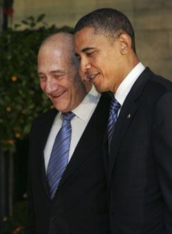 Israel's Prime Minister Ehud Olmert (L) walks with US Democratic presidential candidate Senator Barack Obama during their meeting in Jerusalem July 23, 2008. [Agencies]