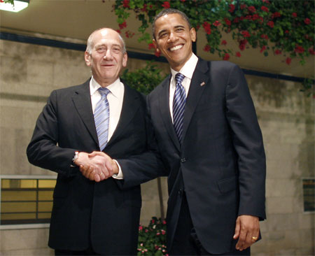 US Democratic presidential candidate Senator Barack Obama (R) shakes hands with Israel's Prime Minister Ehud Olmert in Jerusalem July 23, 2008. [Agencies]