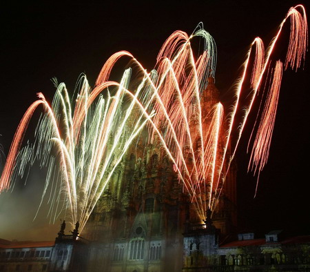 Fireworks explode over an ancient cathedral in Santiago de Compostela during celebrations for St James's Day in northwestern Spain July 25, 2008. [Agencies]