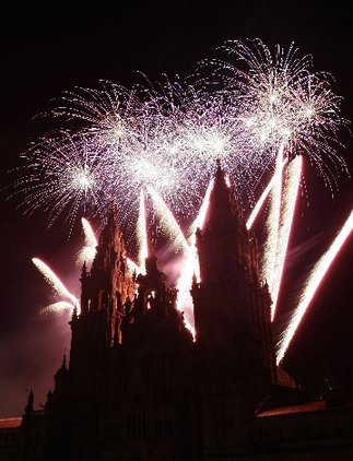 Fireworks explode over an ancient cathedral in Santiago de Compostela during celebrations for St James's Day in northwestern Spain July 25, 2008. [Agencies]
