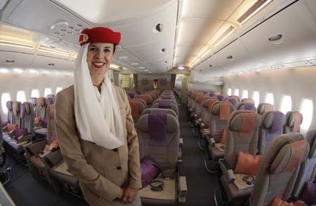 A steward poses at the economy class section of an A380 aircraft during a hand-over ceremony in Hamburg, July 28, 2008. [Agencies]