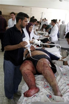 People injured in multiple bomb attacks get treatment in a hospital in Baghdad, Iraq, Monday, July 28, 2008. Three suicide bombers and a roadside bomb have struck Shiite pilgrims taking part in a massive religious procession in Baghdad, killing at least 24 people and wounding 72. [Agencies]