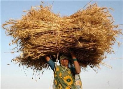 A farmer carries wheat crop as she walks back to her home at Bhadari village, near the northern Indian city of Allahabad, April 8, 2008. [Agencies]