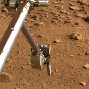 This image taken July 14, 2008 by the Surface Stereo Imager on Phoenix Mars Lander shows the silver colored rasp protruding from the lander's robotic arm scoop. Minerals in the soil of Mars show it was covered once by lakes and other bodies of water that could have supported life, US researchers reported on Wednesday. [Agencies]
