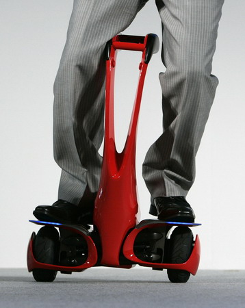 Toyota Motor Corp Partner Robot Division Project General Manager Yoshihiro Kawaharazaki demonstrates the company's Winglet "M" personal transport assistance robot in Tokyo August 1, 2008. The robots, which are under development and have a top speed of 6 km/h (3.7 mph), are designed to allow people to travel in an upright standing position with regular pedestrians. [Agencies]