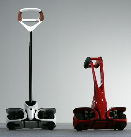 Updated: 2008-08-01 14:37 ![]() Toyota Motor Corp Winglet "M" personal transport assistance robot (R) is pictured next to an "L" model in Tokyo August 1, 2008. The robots, which are under development and have a top speed of 6 km/h (3 mph), are designed to allow people to travel in an upright standing position with with regular pedestrians. [Agencies] |