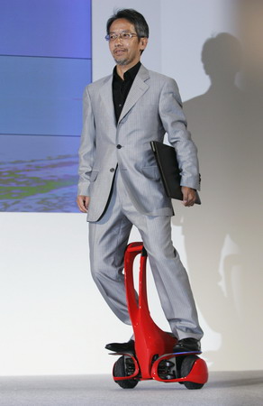 Updated: 2008-08-01 14:37 ![]() Toyota Motor Corp Partner Robot Division Project General Manager Yoshihiro Kawaharazaki demonstrates the company's Winglet "M" personal transport assistance robot in Tokyo August 1, 2008. The robots, which are under development and have a top speed of 6 km/h (3.7 mph), are designed to allow people to travel in an upright standing position with regular pedestrians. [Agencies] |