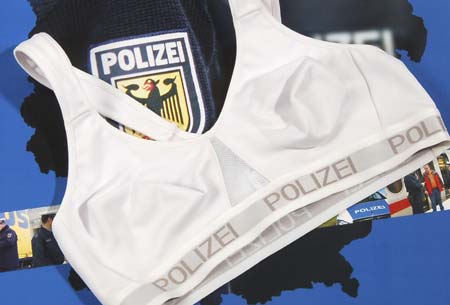 Made of white cotton and featuring the word "Polizei" (Police) along the seam, the bras are meant to better protect police women who wear bullet-proof vests. "There was a slight safety risk for women wearing normal bras with metal parts underneath a bullet-proof vest," a police spokesman in the northern city of Hanover said. "If the vest is hit by a projectile, this can have an impact on the metal bit in the bra underneath and cause injuries." Some 3,000 police women working for Germany's federal police will be equipped with the new bras which feature no metal parts and look like sports bras, the spokesman said.