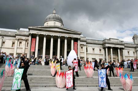 Actors perform during the Trafalgar Square Festival held in London, Britain, on August 7, 2008. The three-week-long Trafalgar Square Festival includes three parts: China Inspires, Olympics Aspirations, and Images of London. [Xinhua]