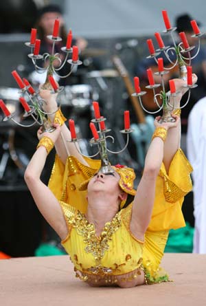 An Actress performs acrobatics during the Trafalgar Square Festival held in London, Britain, on August 7, 2008. [Xinhua]