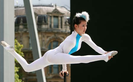 An actress performs acrobatics during the Trafalgar Square Festival held in London, Britain, on August 7, 2008. [Xinhua]