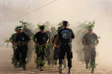 A group of young Palestinian Hamas militants display their skills during a graduation ceremony held at a training camp in Gaza city, Aug. 10, 2008. [Xinhua]