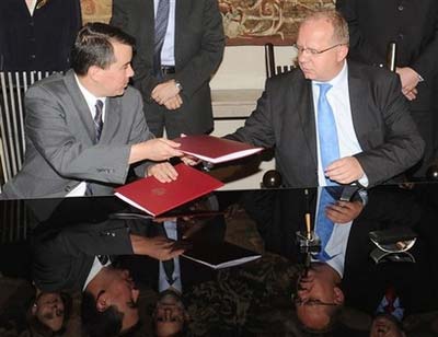 Chief US negotiator John Rood, left, and Polish negotiator Andrzej Kremer exchange documents they just signed on an initial agreement on conditions for placing a US missile defense base in Poland, in Warsaw, Poland, Thursday, Aug.14, 2008. [Agencies]
