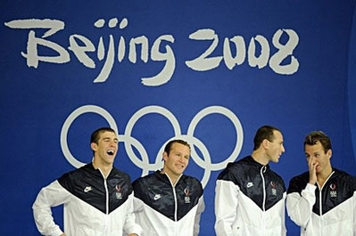US swimmers Michael Phelps (L), Brendan Hansen (2nd L), Jason Lezak (2nd R) and Aaron Peirsol (R) stand on the podium for the men's 4 x 100m medley relay swimming final medal ceremony at the National Aquatics Center during the 2008 Beijing Olympic Games in Beijing. [Agencies]