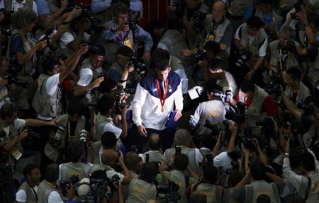 Photographers surround Michael Phelps of the US after he won his eighth gold medal of the games at the National Aquatics Center during the Beijing 2008 Olympic Games, August 17, 2008. [Agencies]