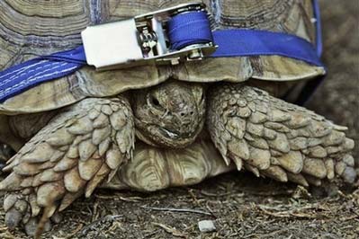 The 55-pound turtle is unable to move herself forward with her front legs alone. So the zoo's staff built her a metal board with two wheels that can be strapped to her stomach. Arava arrived in Jerusalem a few months ago from a petting zoo in southern Israel with the unexplained handicap, and found no reptile romance. Zoo curator Shmulik Yedvad says it's not that Arava has come out of her shell with her unique new wheelchair, but that a particularly amorous 10-year-old male has been after her. |