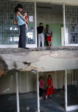 Refugees from the zone of the armed conflict between Georgia and South Ossetia stand inside a temporary shelter in Tbilisi August 19, 2008. [Agencies]