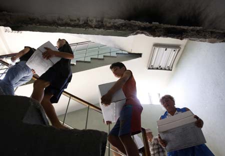 Refugees from the zone of the armed conflict between Georgia and South Ossetia carry humanitarian aid in Tbilisi, August 19, 2008. [Agencies]
