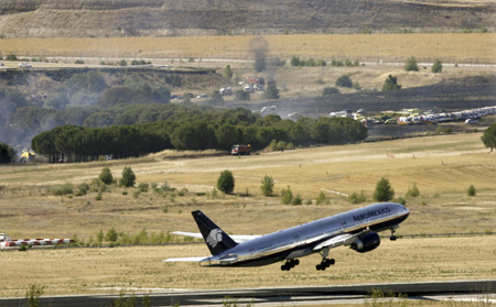 A passenger jet takes off as smoke rises from the scene of the crash where a Spanair MD-82 jet bound for Las Palmas in the Canary Islands skidded off the runway and crashed at Madrid's Barajas airport on August 20, 2008. A jetliner heading to the popular Canary Islands vacation resort crashed during takeoff Wednesday, turning a wooded area off the end of a runway into a hellish scene of charred bodies and smoldering wreckage. Some 153 were believed dead. [Agencies]